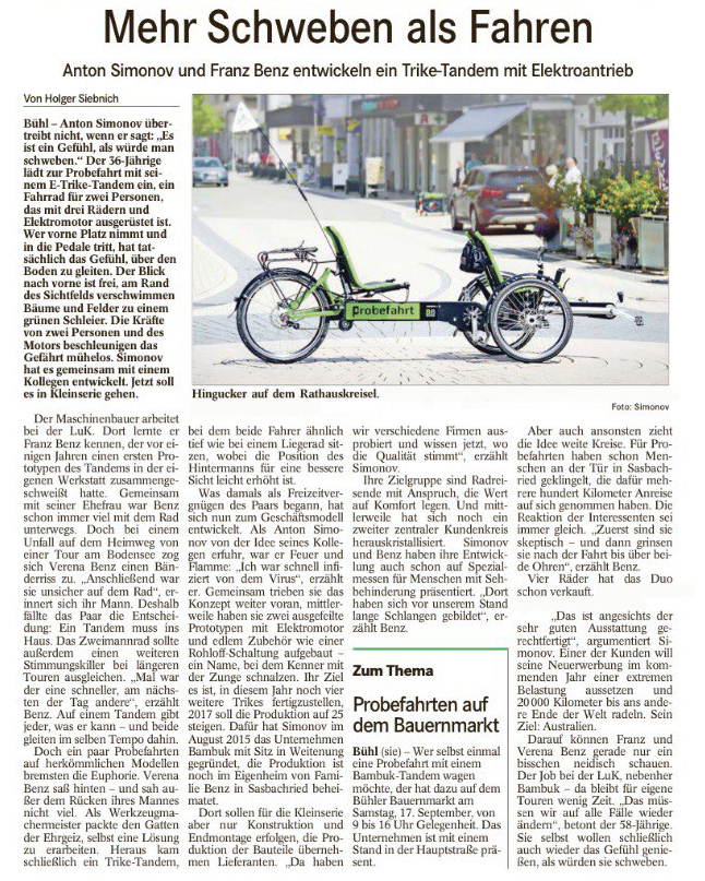 BamBuk E-Trike Tandem am 17.09.2016 auf der Hauptstraße in Bühl (Baden) präsentiert