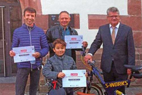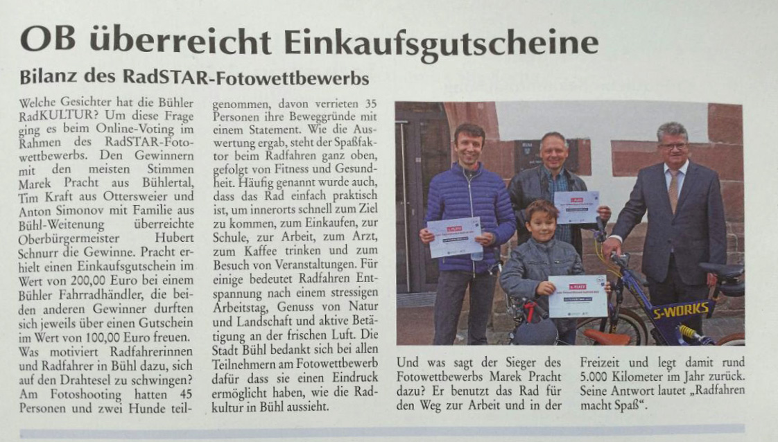 What faces does Bühler RadKULTUR have? This was the question in the online voting as part of the RadSTAR photo competition. The winners with the most votes, Marek Pracht from Bühlertal, Tim Kraft from Ottersweier and Anton Simonov and family from Bühl-Weitenung (BamBuk E-Trike Tandem team), were presented with their prizes by Mayor Hubert Schnurr. Pracht received a shopping voucher worth 200 euros from a Bühl bicycle dealer, while the other two winners each received a voucher worth 100 euros. What motivates cyclists in Bühl to get on their bikes? 45 people and two dogs took part in the photo shoot, 35 of whom revealed their motivations with a statement. As the analysis showed, the fun factor is at the top of the list when it comes to cycling, followed by fitness and health. Another frequently mentioned reason was that cycling is simply a practical way to get to your destination quickly within the city, to go shopping, to school, to work, to the doctor for a coffee and to attend events. For some, cycling means relaxing after a stressful day at work, enjoying nature and the countryside and being active in the fresh air. The town of Bühl would like to thank all participants in the photo competition for giving us an impression of the cycling culture in Bühl.